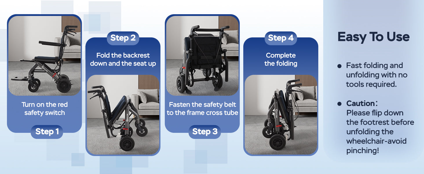 It folds quickly using the rear safety switch, and the telescopic handle makes pushing and transporting more convenient for caregivers.