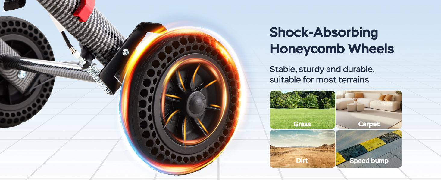 The shock-absorbing front and rear wheels are suitable for indoor floors, bathroom tiles, sidewalks, grass, and light outdoor terrain, offering smooth and stable movement in daily use.