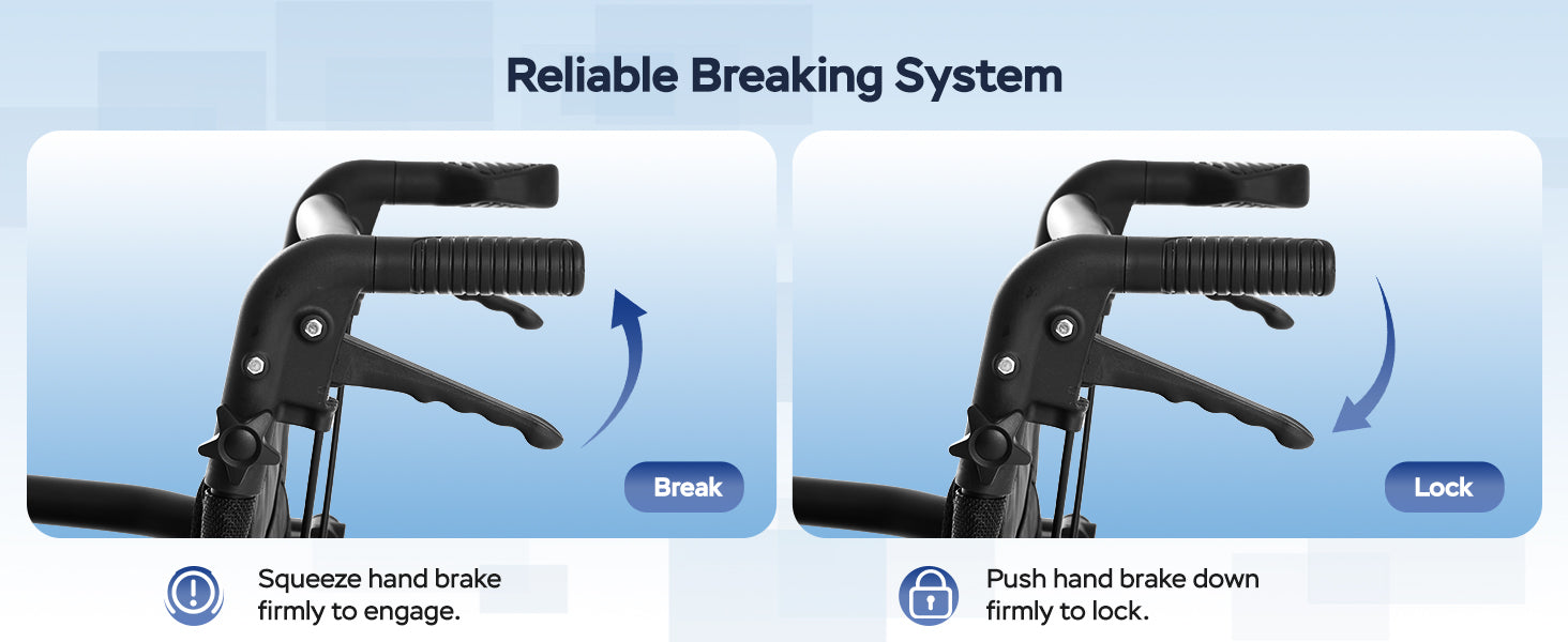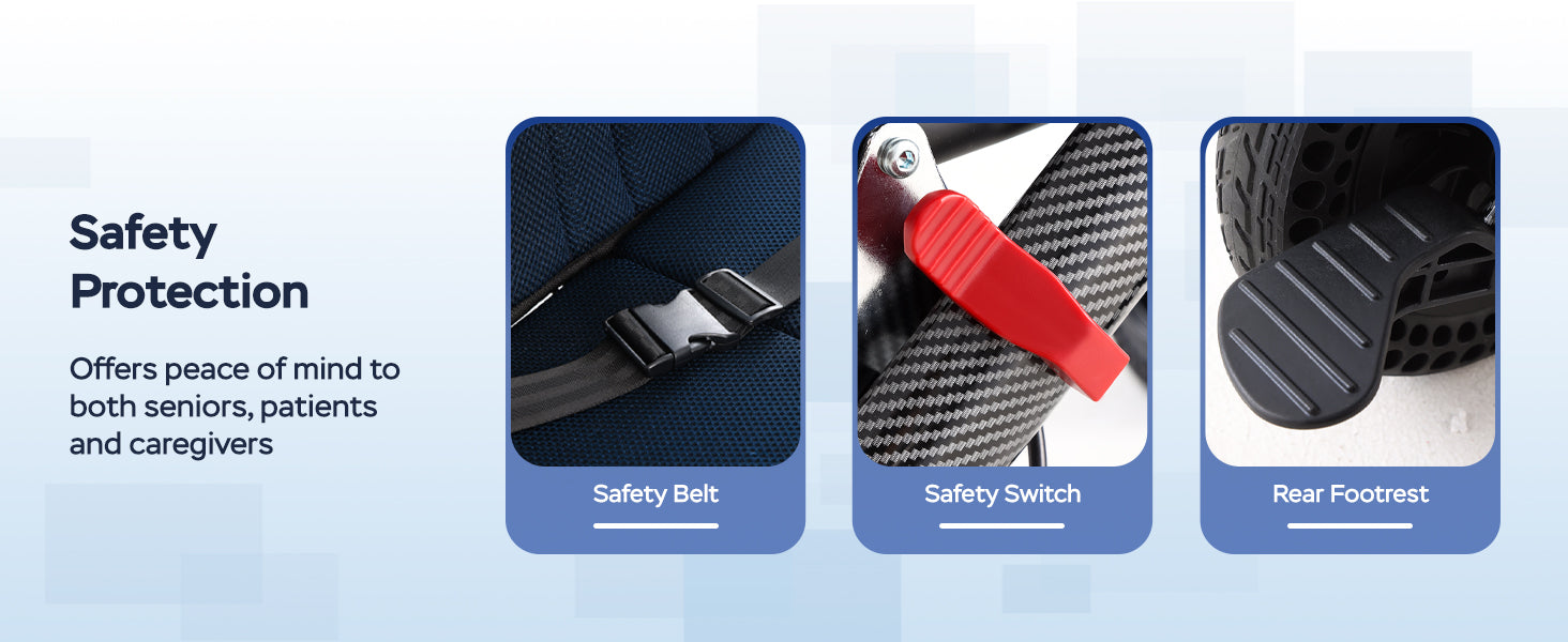 - Safe&Steady: Equipped with hand brakes for braking and parking, this wheelchair ensures safe travel and stable docking on ramps or uneven surfaces. A separate rear pedal allows easy threshold crossing—step gently to lift the front wheels for a smoother ride. Safety belts on both sides of the seat prevent the user from slipping, enhancing overall safety.