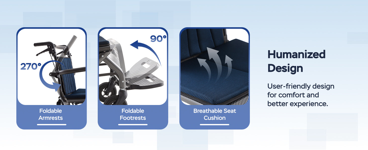 🦽 Comfort-Focused – Breathable seat cushion and soft, reversible armrests.