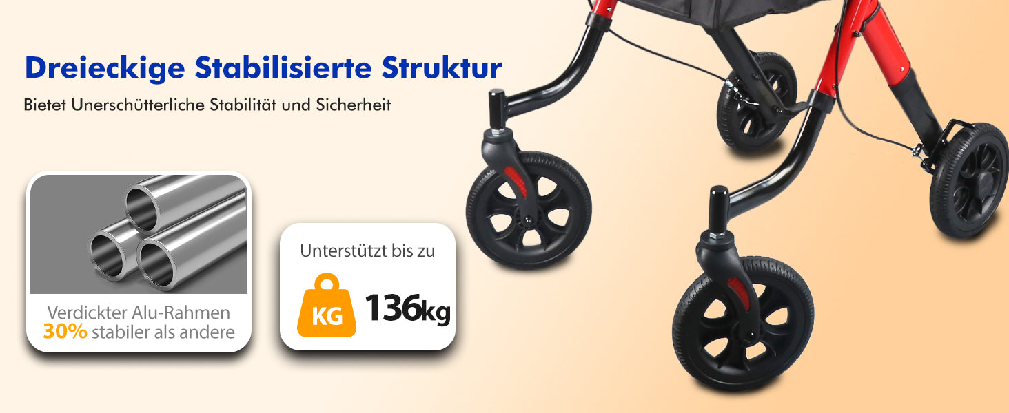 This rollator supports up to 136 kg (300 lbs), providing stable and reliable support for daily use.