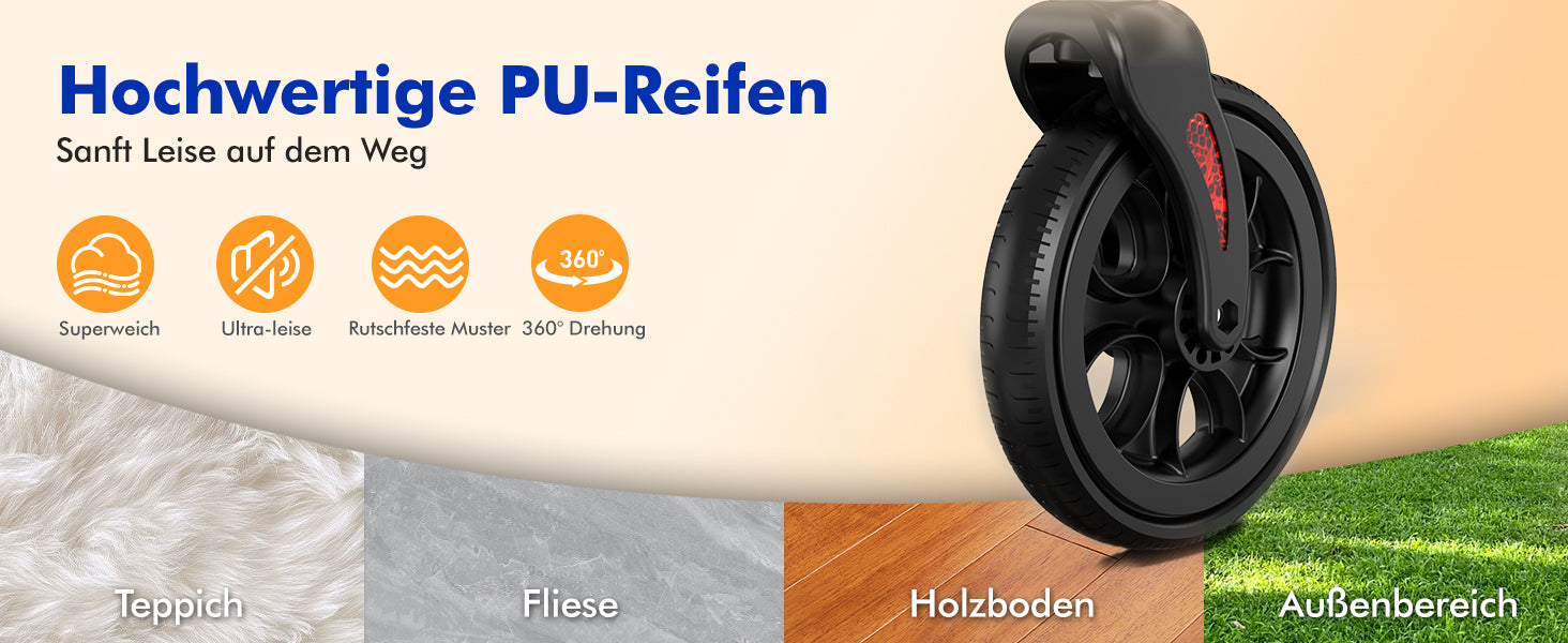 - Innovative PU soft wheels: equipped with 20 cm PU soft wheels, which are super soft, ultra-quiet and non-slip - ideal for carpet, tiles, wooden and outdoor floors.