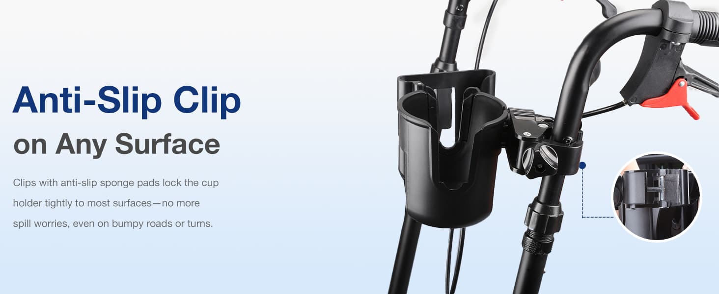 - Universal Cup Holder:This multifunctional walker cup holder fits most walkers, wheelchairs,power chairs, electric scooters, strollers, bicycles, shopping carts, motorcycles, treadmills,rolling walkers,beach chairs and more. The clamp is adjustable from 0.60 inches to 1.69 inches, compatible with most poles or handles.