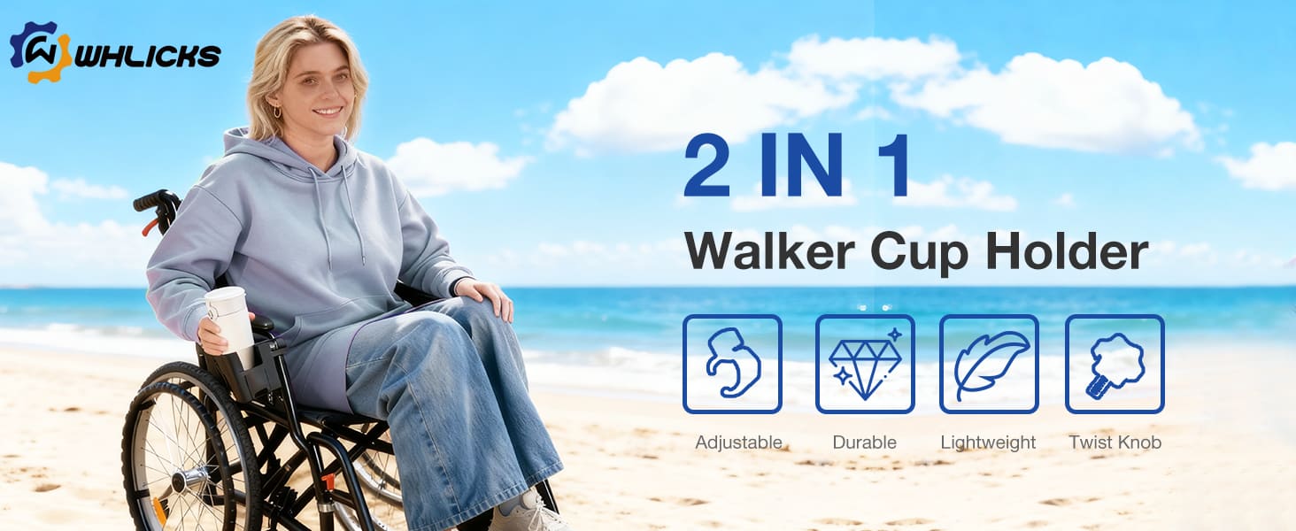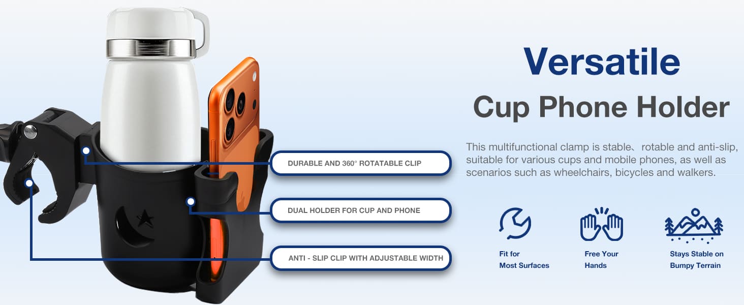 Keep drinks and phones within easy reach while on the move. Perfect for seniors using walkers, rollators, wheelchairs, or scooters, this 2-in-1 cup holder makes outings safer, easier, and more convenient.