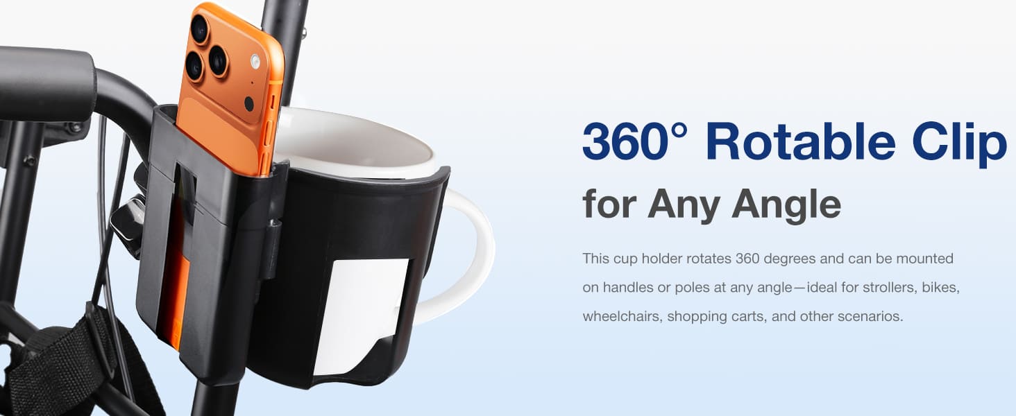 - Easy Installation:Lightweight and tool-free, it’s easy to install and use. The clamp also rotates 360 degrees for angle adjustment—simply twist the screw to the right width, then tighten to fix the cup holder firmly.
