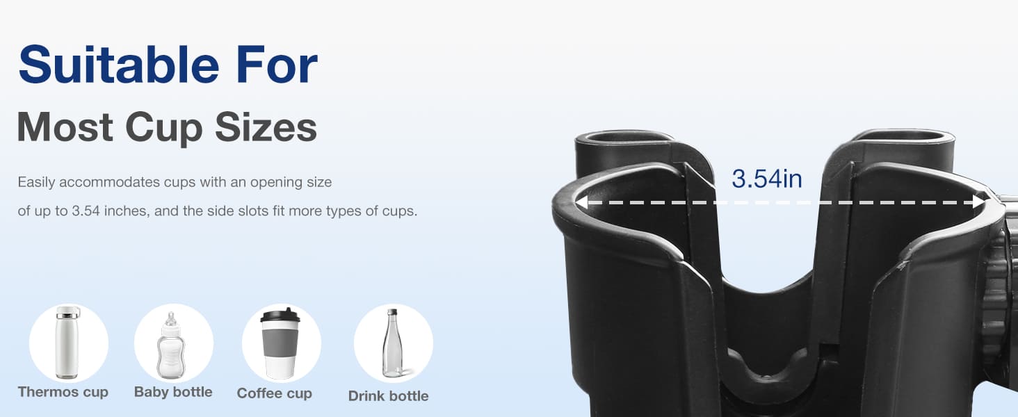 It works with water bottles, coffee cups, baby bottles, insulated mugs, and cups with handles. One side has a slot specifically designed for handle-equipped cups.