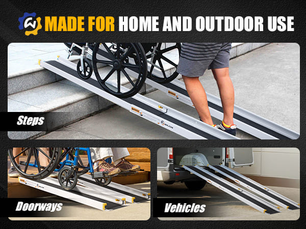 Durable and Stable: The wheelchair ramp is made of sturdy aluminum alloy, supporting up to 600 lbs. It lets you move easily over steps or uneven surfaces. Its corrosion-resistant surface extends service life for long-term daily use. When bearing heavy loads, the ramp may bend slightly but has strong elasticity to bounce back quickly.
