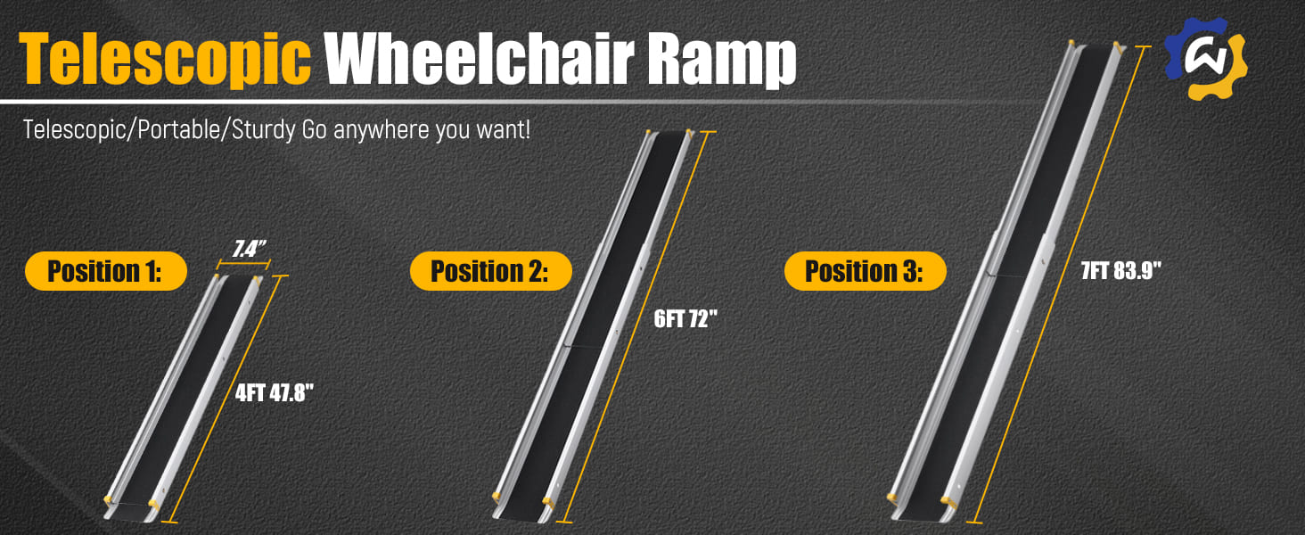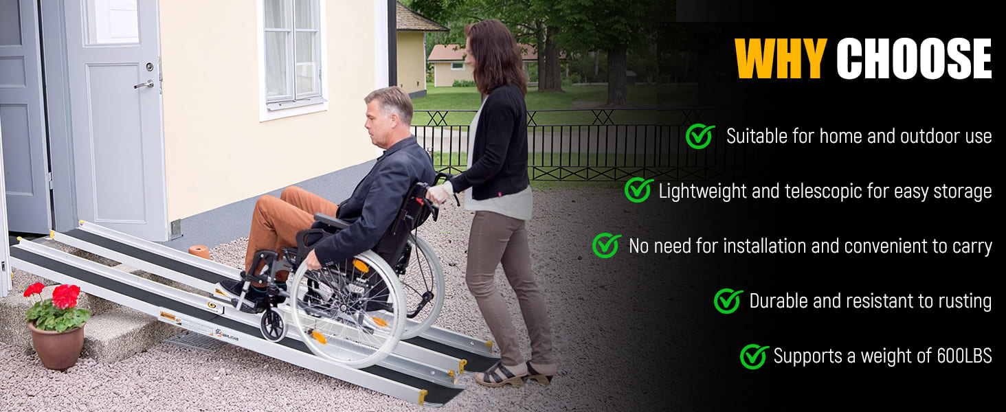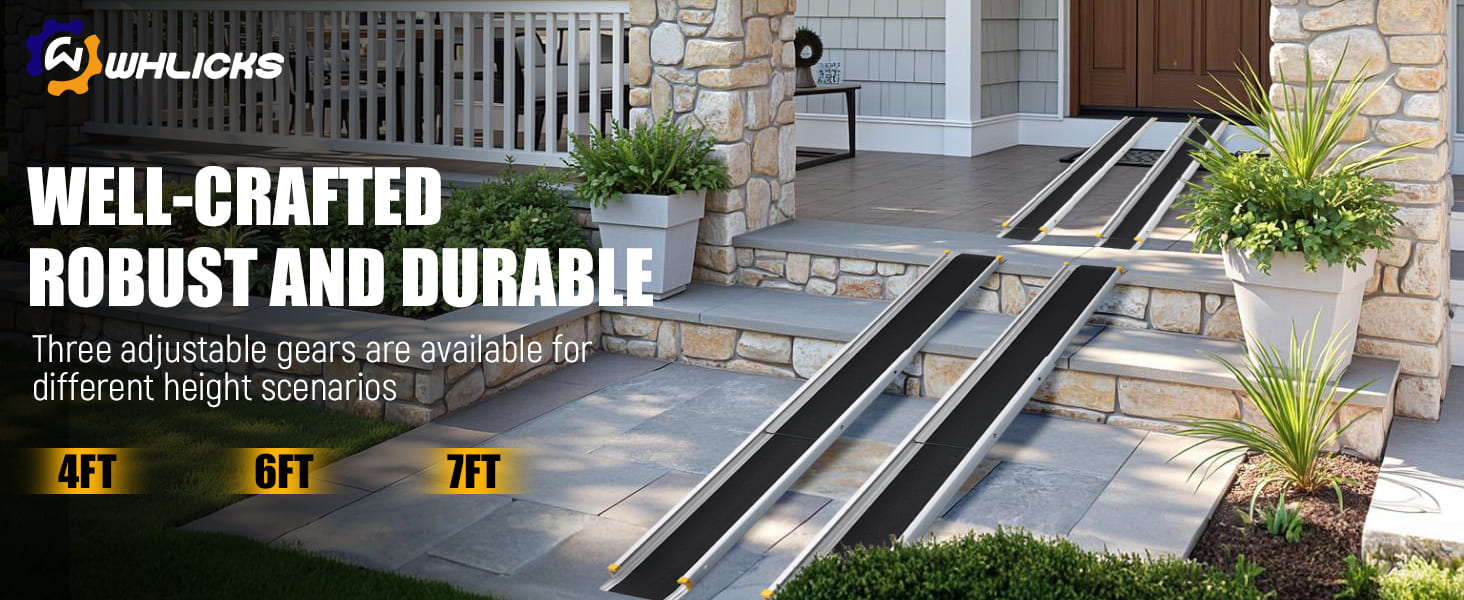 The WHLICKS telescopic ramp — sturdy, safe, and adjustable. Perfect for seniors, caregivers, or anyone using wheelchairs, walkers, or bikes.