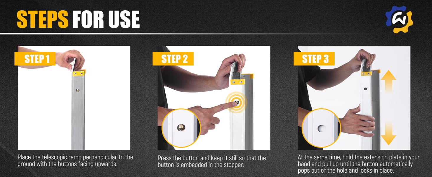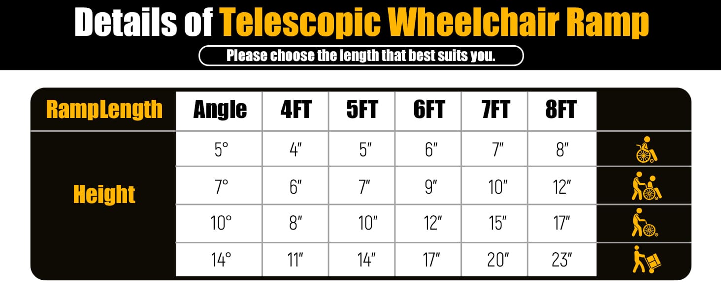 Easy Use: The wheelchair ramp is easy to install without the need for tools. The telescopic wheelchair ramp can be set up quickly; just press the button lock to extend it. The kit comes with a storage bag, making it easy for you to carry it in any car or truck. The wheelchair ramp should be used with the assistance of another person.